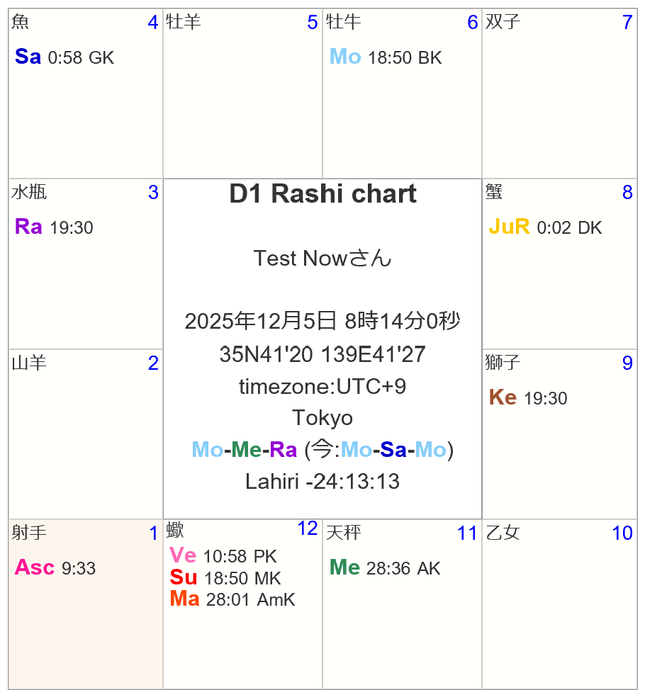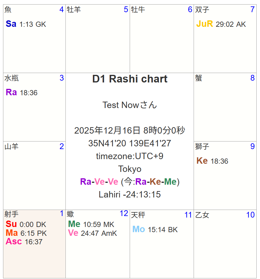 火星と太陽が射手座でコンジャンクトし、土星&木星もアスペクト、インパクトがありそうなサンクランティー図ですね。この後、月が移動してきて、20日に射手座で新月を迎え、同日に金星が射手座入り、29日に水星が射手座に入室します。年末に掛けて、月、ラーフ、ケートゥ以外の惑星が射手座に影響を及ぼすことになります。
