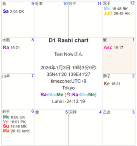 ここから、1時間ぐらい魚座ラグナが続き、牡羊座ラグナ、牡牛座ラグナ、双子座ラグナと変遷していきます。双子座ラグナが一番いいかなといったところですね。