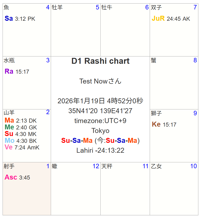 山羊座に入ってすぐの4:30での新月です。14日のマカラ・サンクランティーを受けての新月、ウッタラヤナに入ってすぐ、2026年入って初めての新月です。高揚火星、水星、金星が絡む新月図です。
